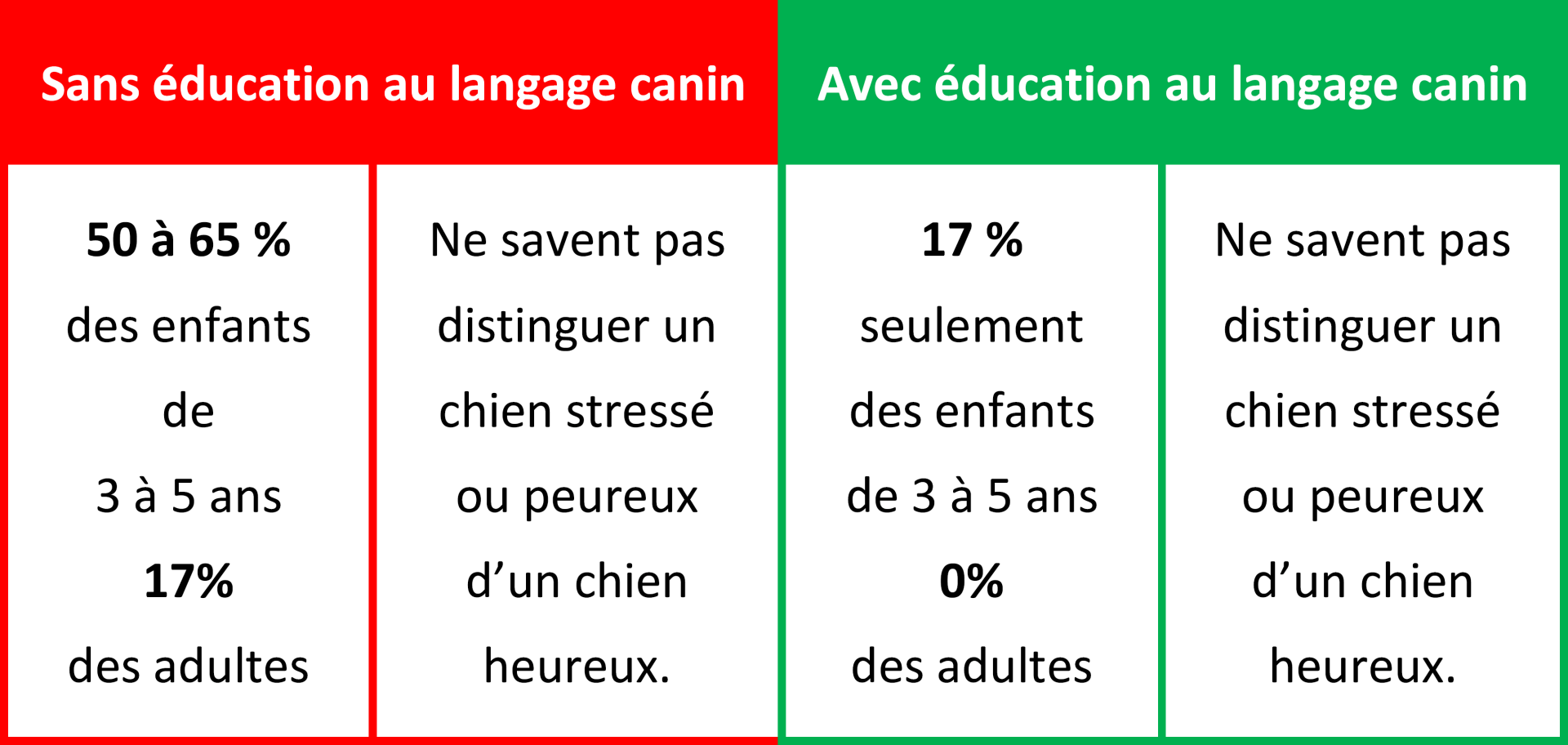 - Sans éducation au langage canin entre 50 et 65% des enfants entre 3 et 5 ans ne savent pas distinguer un chien stressé, d'un chien heureux.